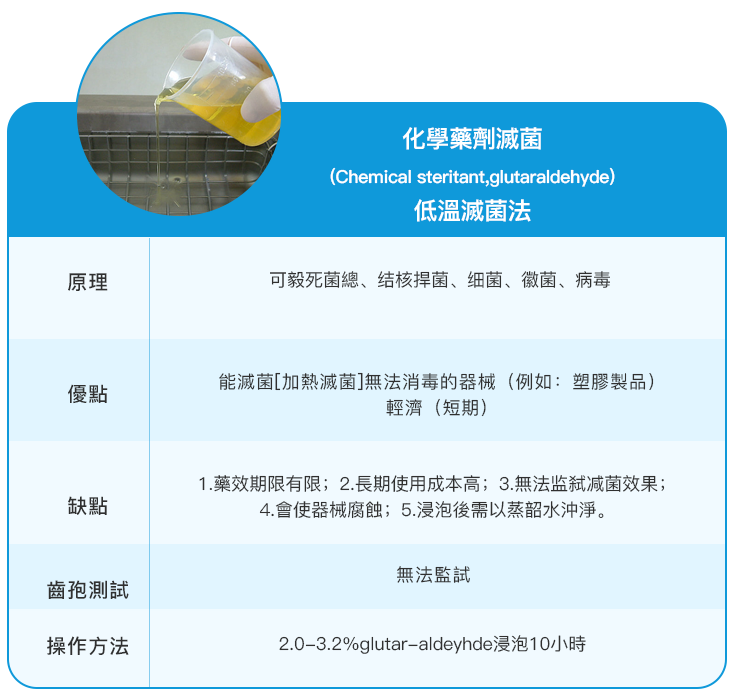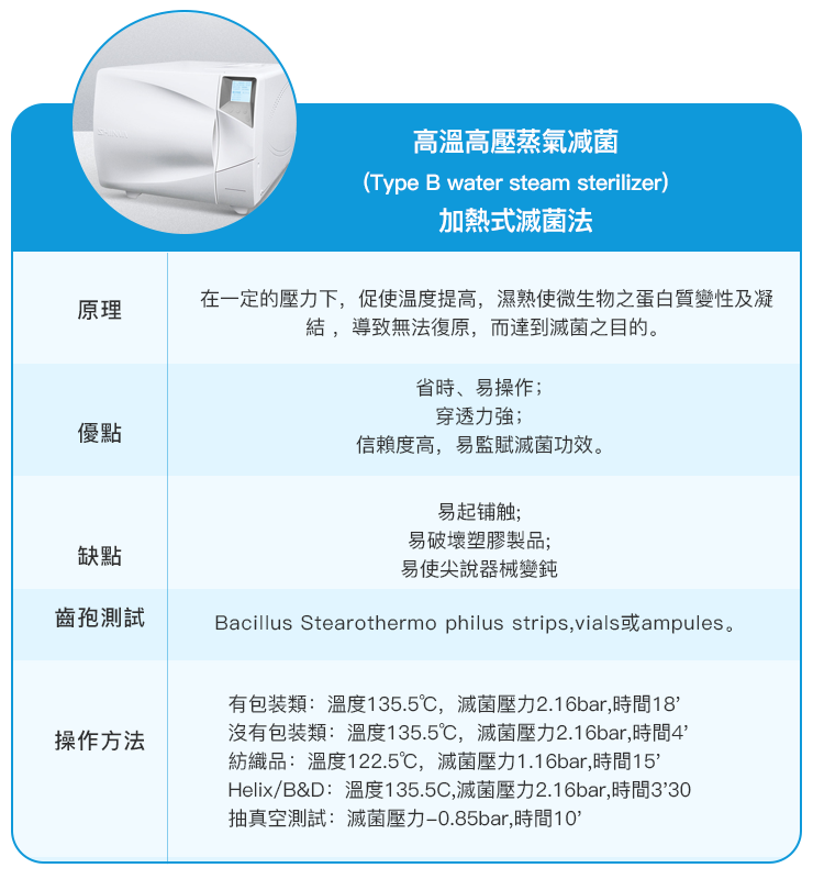 高溫可殺死微生物,濕度同溫度高嘅蒸氣係最為有效及最環保嘅消毒方式。只要蒸氣可以滲透到器械嘅縫隙與管路,蒸氣會係最有效嘅滅菌方式。