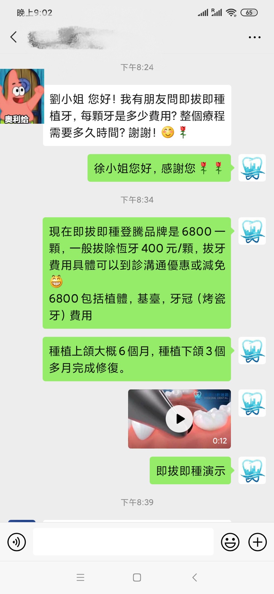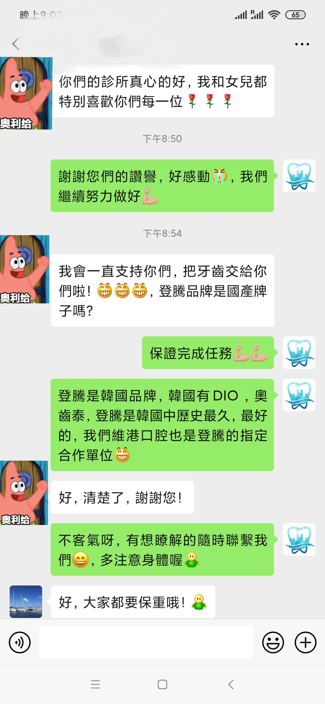 前幾天收到老顧客徐女士讯息,徐女士表達了對我們的關心,同時也是來幫朋友諮詢種牙費用的,徐女士先前在我們維港口腔種了兩顆牙,徐女士的女兒王小姐亦在我們牙科做著牙齒矯正,此次給與我們真誠的好評,令到我們牙科同事都十分開心和感動。徐女士經常向其朋友介紹我們單位,同時推薦了很多的朋友過來看牙。在這裡,維港口腔非常感謝徐女士、王小姐以及顧客朋友們的好評以及推薦,我們維港口腔會繼續保持初心,堅守醫療本質,服務好每一個客人,切切實實幫客人解決口腔問題。