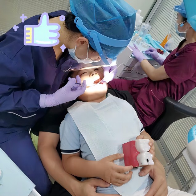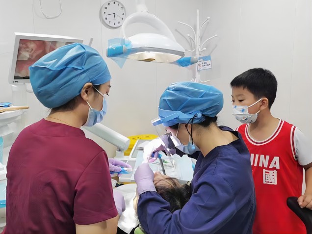 小朋友的爸爸媽媽很有耐心,慢慢溝通引導,再次開始治療時,爸爸躺在牙椅上抱著他,媽媽在旁邊一直陪同,我們的醫生和護士也在鼓勵他,很快,本次治療順利完成!