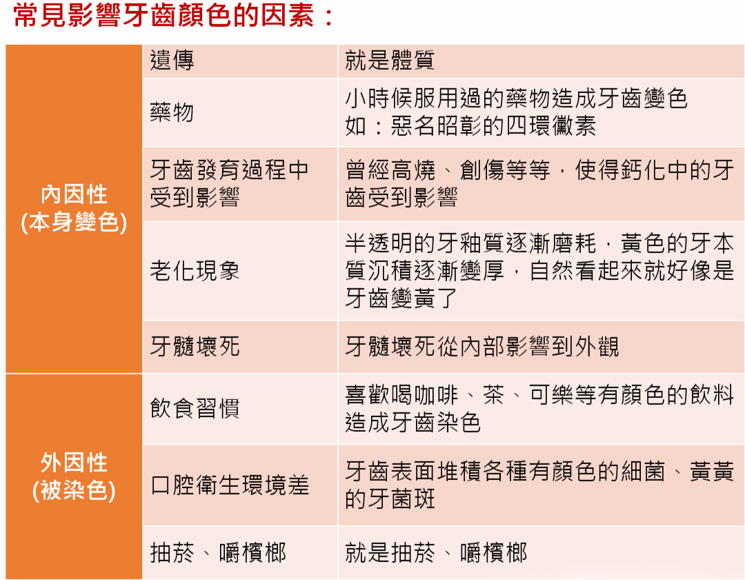 這分類簡單一點,內因性的牙齒顏色不一樣就好比是黑人跟白人的差別;而外因性造成的牙齒變色可以比作雖然生下來是白人,但是天天曬太陽,就曬黑了。換作是牙齒也是一樣,死掉的牙齒(牙髓壞死)也會變色。