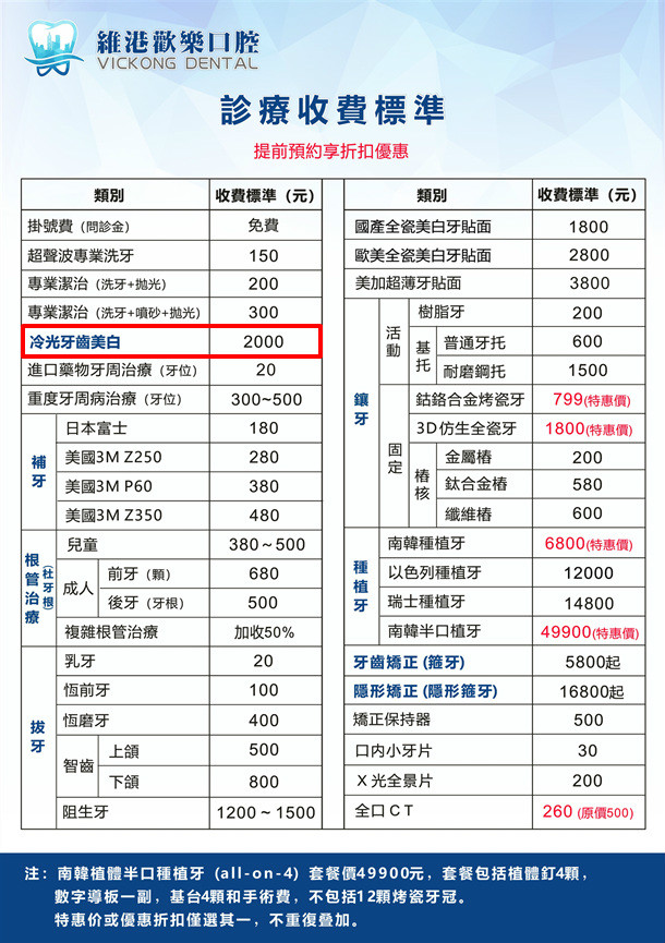 那麼深圳現在的冷光美白價錢為多少呢?深圳維港歡樂口腔綜合了深圳市冷光美白的行業市場價格做出如下優惠定價: