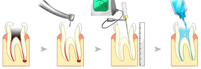 2、根管預備:包括揭髓頂,進入髓腔,清理壞死組織,擴大根管,沖洗及測量牙齒長度等。