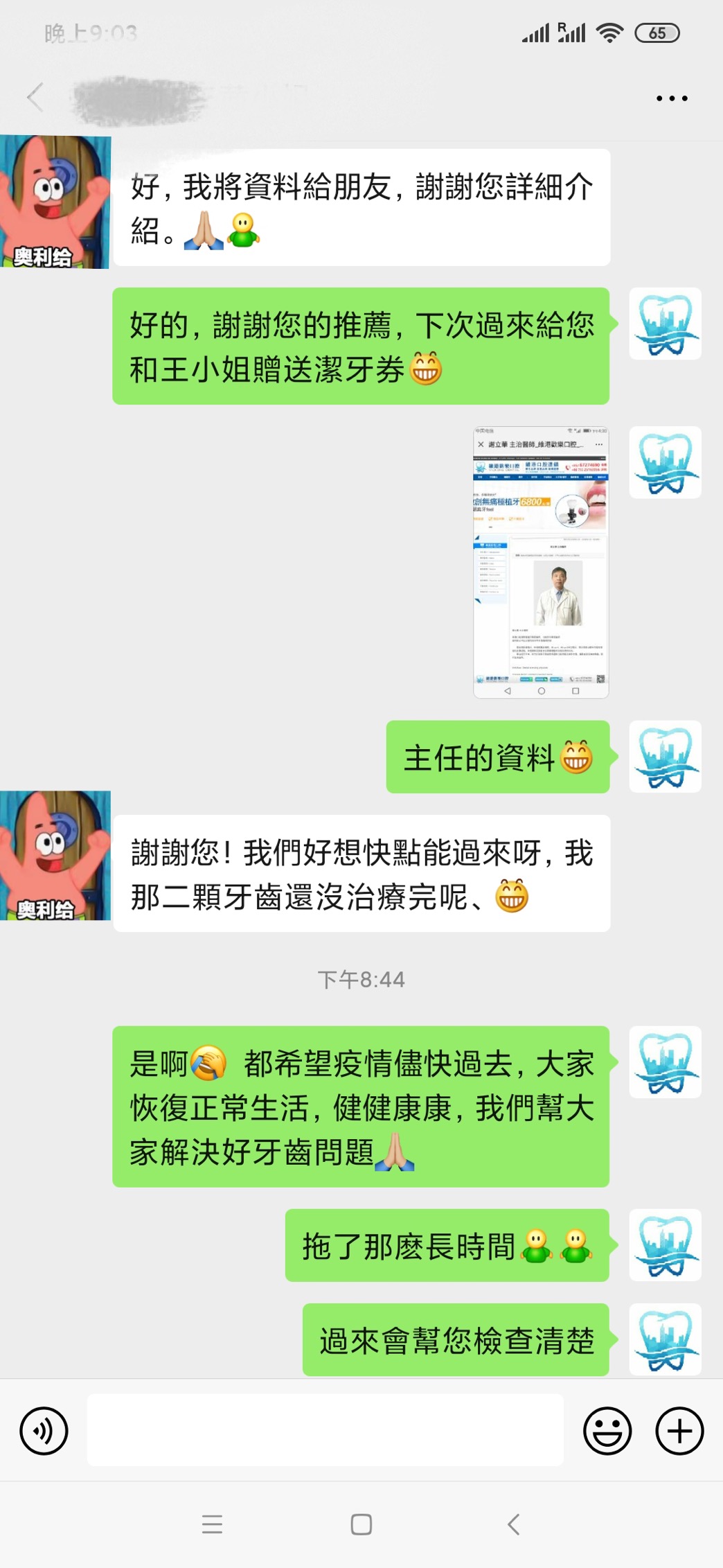 前幾天收到老顧客徐女士讯息,徐女士表達了對我們的關心,同時也是來幫朋友諮詢種牙費用的,徐女士先前在我們維港口腔種了兩顆牙,徐女士的女兒王小姐亦在我們牙科做著牙齒矯正,此次給與我們真誠的好評,令到我們牙科同事都十分開心和感動。徐女士經常向其朋友介紹我們單位,同時推薦了很多的朋友過來看牙。在這裡,維港口腔非常感謝徐女士、王小姐以及顧客朋友們的好評以及推薦,我們維港口腔會繼續保持初心,堅守醫療本質,服務好每一個客人,切切實實幫客人解決口腔問題。