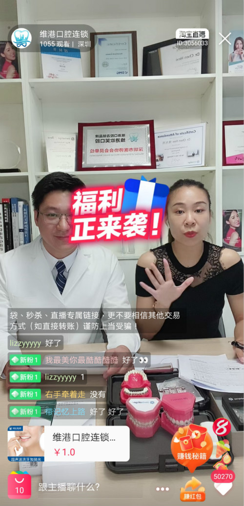 直播中,有“眼尖”粉絲發現帥氣的矯正專家陳何熙主任最近有稍稍胖了一點,紛紛猜測是因為維港口腔的好伙食和開心的工作氛圍的原因,維港口腔的分院名稱“歡樂”、“歡笑”、“加樂”…都好喜慶呀,感覺來了都能天天笑出“魚尾紋”!主播和主持人全程在笑呀,在這裏的牙醫和護士們超有幸福感!也有個別“不老實”的粉絲很關心美女院長的婚嫁問題,由此可能迎來了“看牙是假,看美女是真”的時尚潮流!歡迎在淘寶搜索“維港口腔”或識別文中圖片二維碼觀看精彩回放!