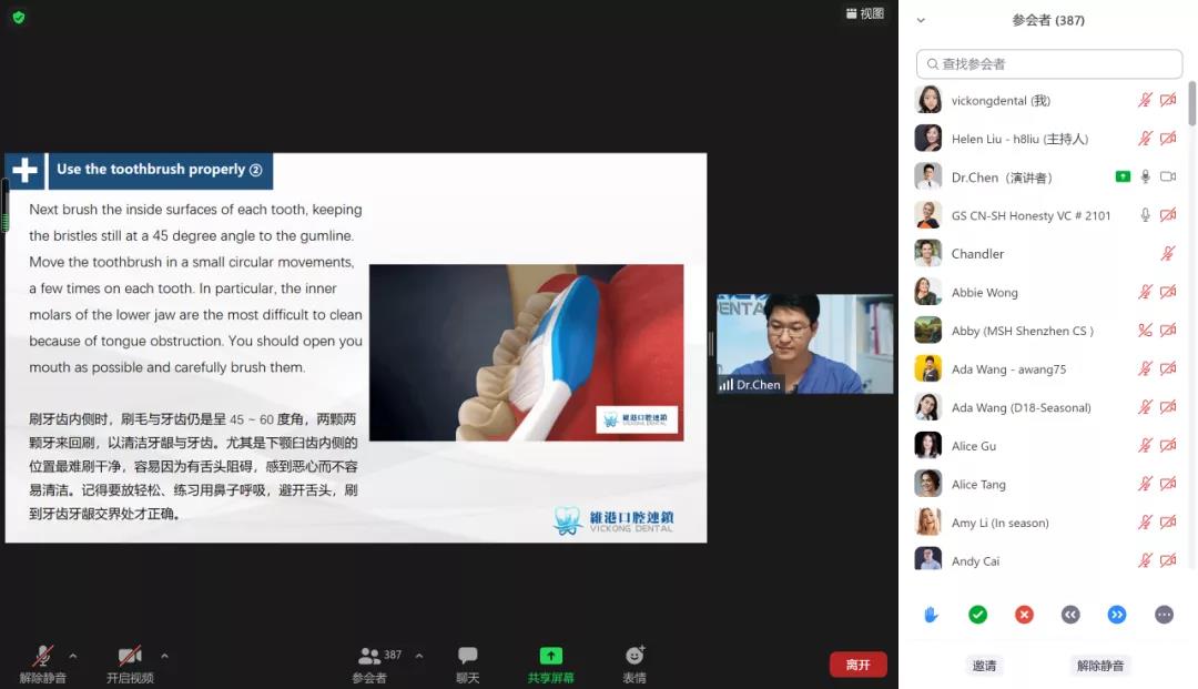 直播講座上,陳主任通過PPT講解、口腔模型演示、視頻播放,為與會的外籍高管人員傳遞科普知識,直觀、生動、形象地讓大家瞭解了如何判斷自己的牙周健康和牙齒健康、常見口腔疾病的防治、牙痛牙傷的緊急處理、牙齒缺失等等。